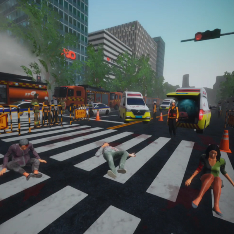 • 간호실습에 참여하는 실습자는 가상의 재난 현장에서 응급 환자들을 대상으로 환자 분류 및 응급 조치 훈련을 수행합니다.