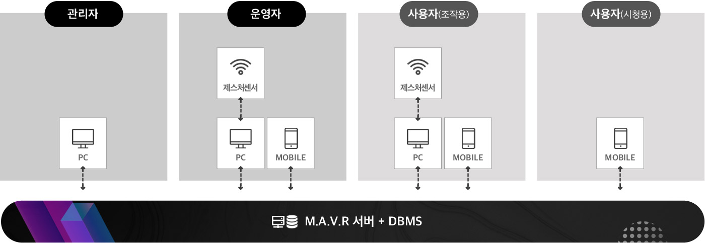 | PC에서 관리툴을 통해 시스템을 관리 | PC에서 런처와Mobile에서 콘텐츠APP을 통해 VR로 접속 | PC에서 런처와 Mobile에서 콘텐츠APP을 통해 VR로 접속 | Mobile에서 콘텐츠 APP을 통해 VR로 접속 |